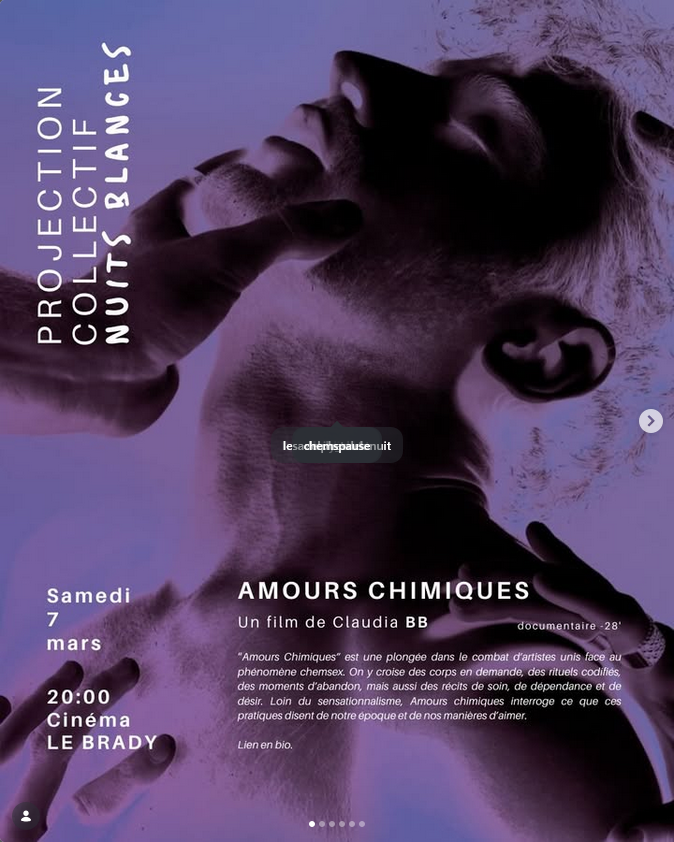 Découvrez le 7 mars prochain au cinema Le Brady à 20h, le premier film du collectif Nuits Blanches, Amours Chimiques, autour du chemsex.
