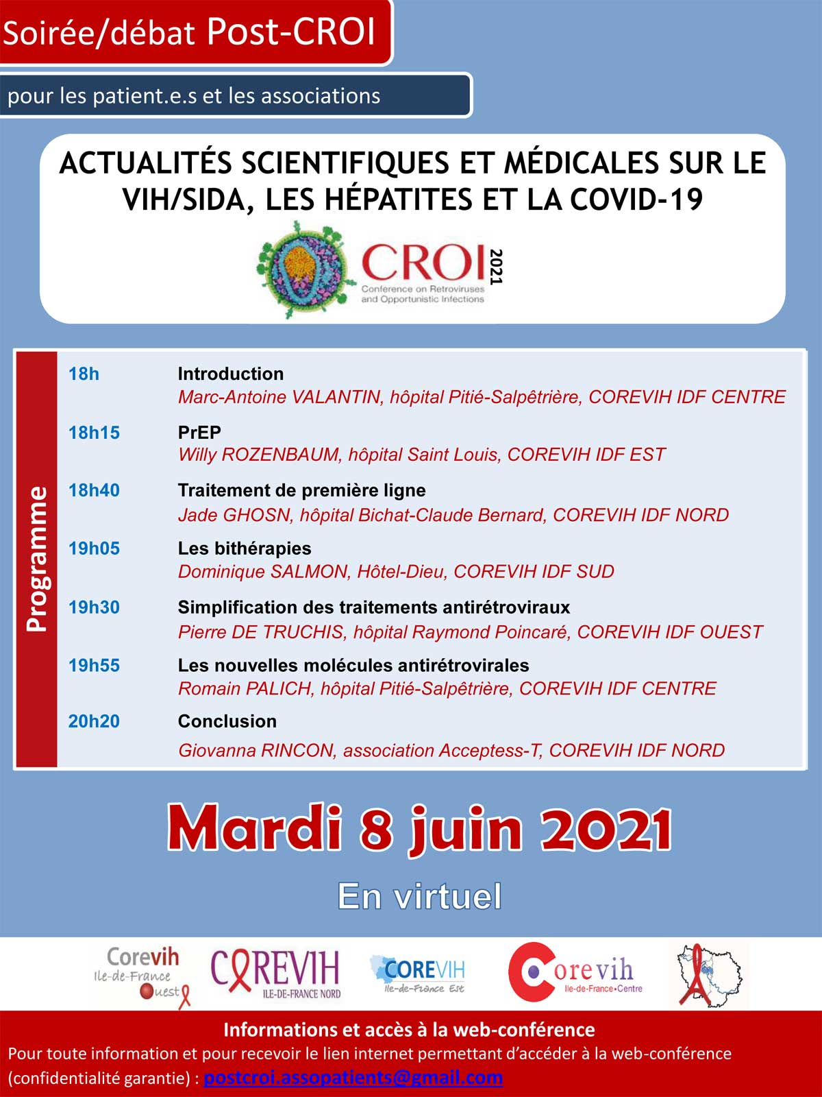 Suite à la CROI 2021 (Conférence internationale sur les Rétrovirus et les Infections Opportunistes),les 5 Corevih franciliens ont le plaisir de vous inviter à une soirée/débat Post-CROI en virtuel.