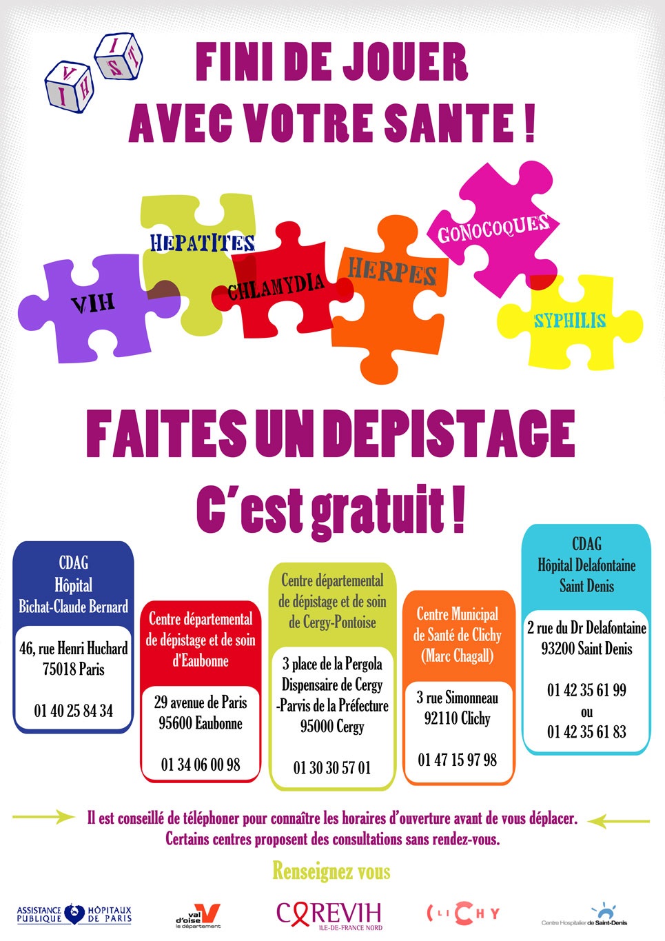 Le groupe de travail « Dépistage dans les CDAG » de la COREVIH Ile-de-France Nord a élaboré une affiche A3 et un flyer A6 pour faire la promotion du dépistage du VIH et des IST ainsi que des centres de dépistage de son territoire.