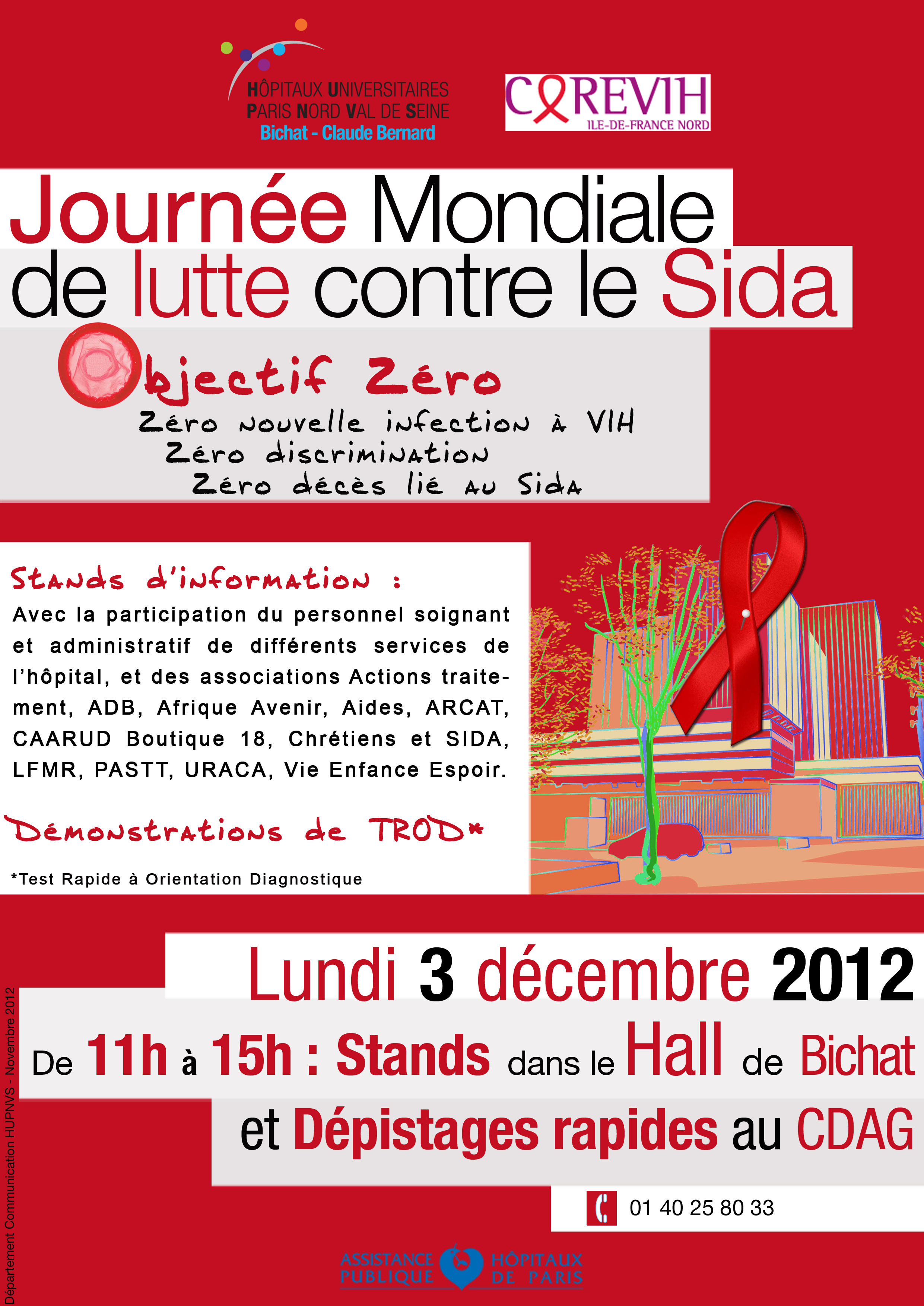 La Journée Mondiale de lutte contre le Sida se déroulera le lundi 3 décembre de 11h00 à 15h00 dans le hall de l’hôpital Bichat Claude Bernard.