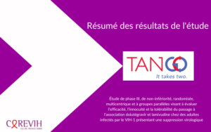 Titre scientifique complet : Étude de phase III, de non-infériorité, randomisée, multicentrique et à groupes parallèles visant à évaluer l’efficacité, l’innocuité et la tolérabilité du passage à l’association dolutégravir et lamivudine chez des adultes infectés par le VIH-1 présentant une suppression virologique (étude TANGO).